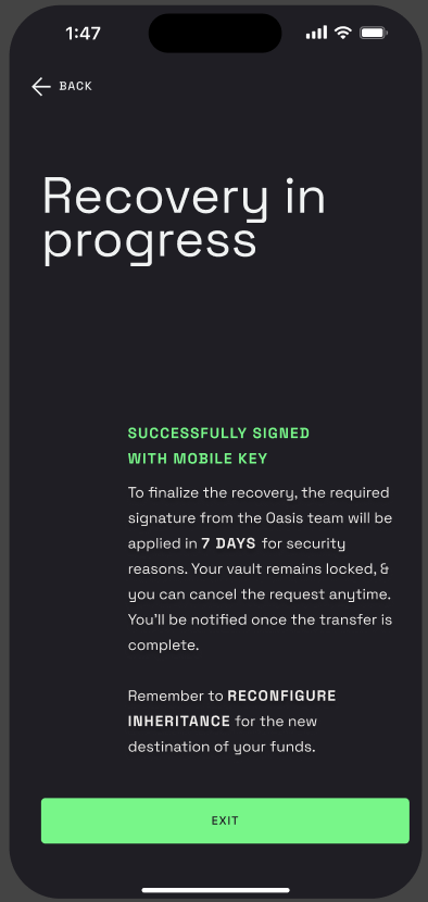 Step 8 -Once you’ve signed the transaction, Oasis will begin a 7-day security hold before signing with our recovery key.